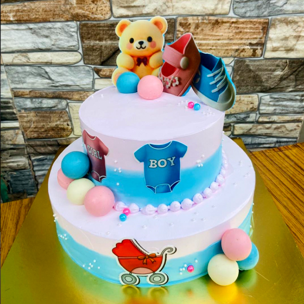 A delightful pastel-themed two-tier cake decorated with baby shoes, teddy bear, and “Boy & Girl” elements, making it perfect for baby showers or gender reveal parties.