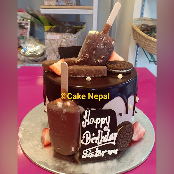 A rich chocolate cake coated with glossy dark chocolate ganache, topped with chocolate ice cream bars, chocolate chunks, cookies, and fresh strawberry slices. Finished with a stylish “Happy Birthday Sister” chocolate plaque, this cake is a perfect treat for chocolate lovers who enjoy a bold and indulgent celebration. 🍫✨