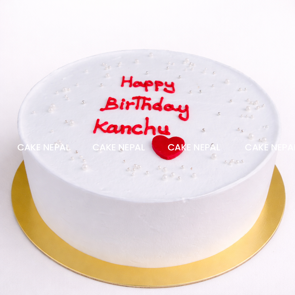 A smooth, elegant white cream cake decorated with delicate sugar pearls, a red heart accent, and a personalized birthday message—perfect for a clean, classy, and heartfelt celebration.