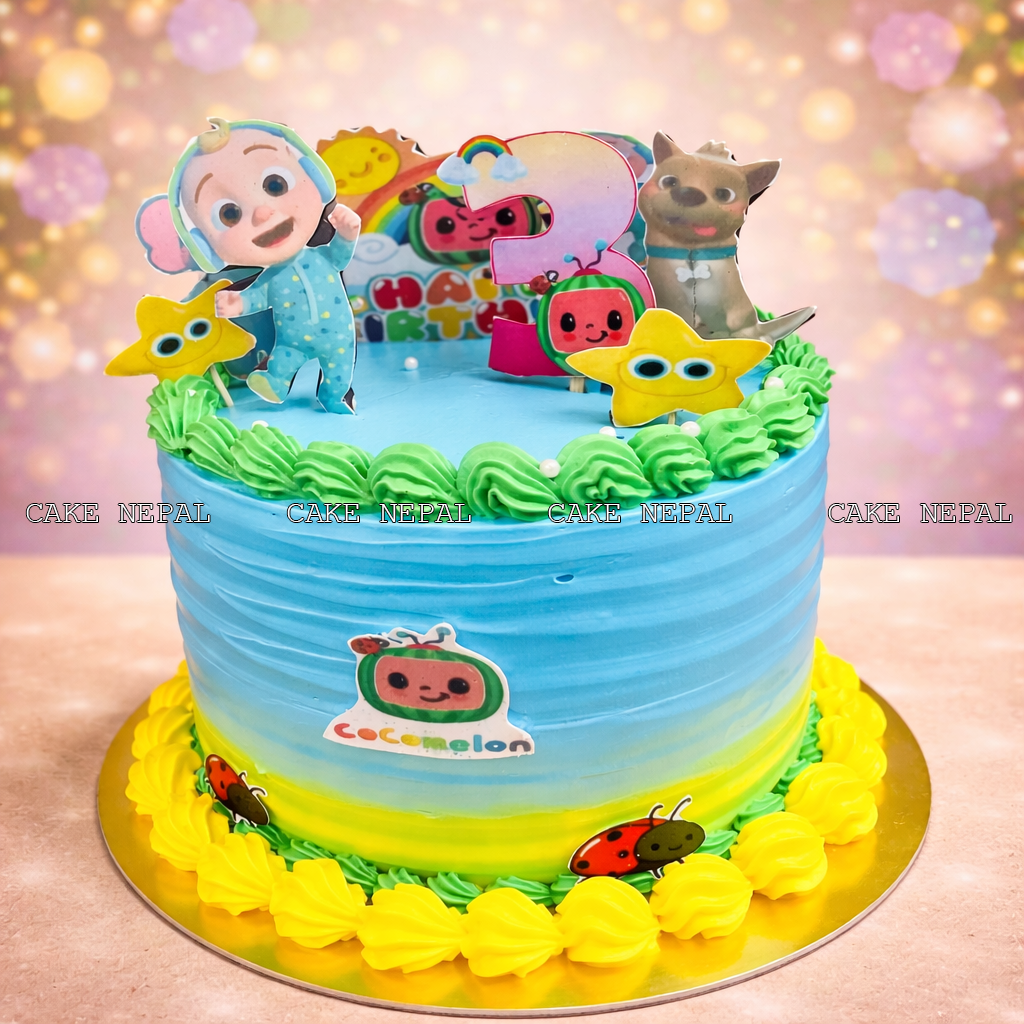 A vibrant and playful Cocomelon-themed cake featuring colorful ombré buttercream, cute character toppers, and fun decorative elements like stars and ladybugs. Perfect for a joyful kids’ birthday celebration filled with smiles and excitement.