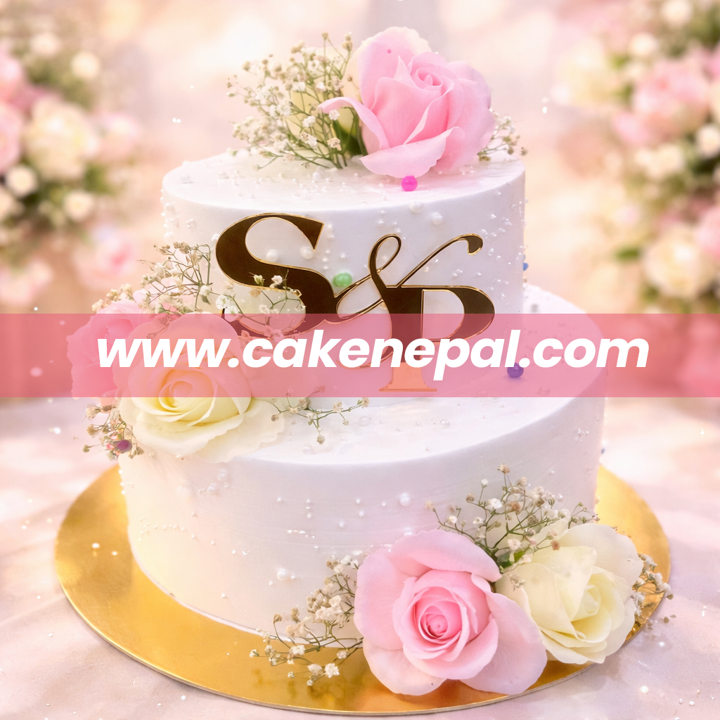 A sophisticated two-tier white cake adorned with delicate pastel roses, baby’s breath accents, and pearl detailing. The gold monogram topper adds a luxurious, personalized touch—perfect for weddings, engagements, or anniversary celebrations.