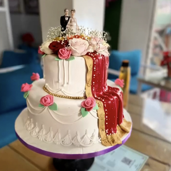A luxurious two-tier white fondant cake decorated with elegant roses, gold accents, and a dramatic red royal drape, topped with a bride-and-groom figurine for a classic wedding look.