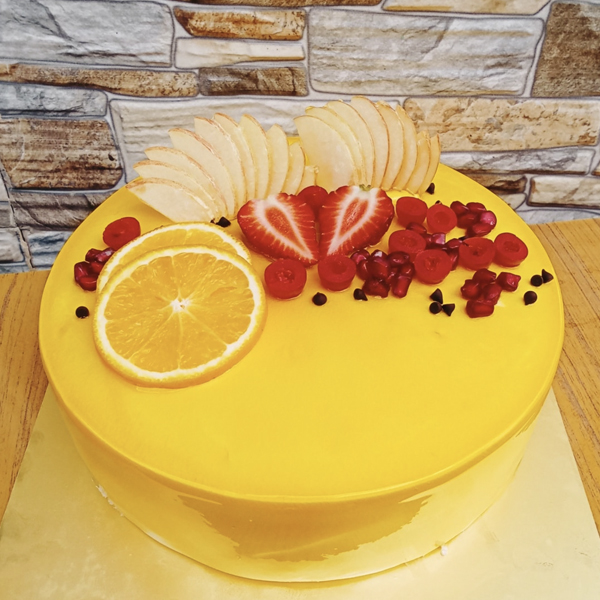 A bright and refreshing cake finished with a smooth yellow glaze and topped with fresh orange slices, apples, strawberries, and pomegranate—perfect for those who love light, fruity flavors with a vibrant, elegant look.