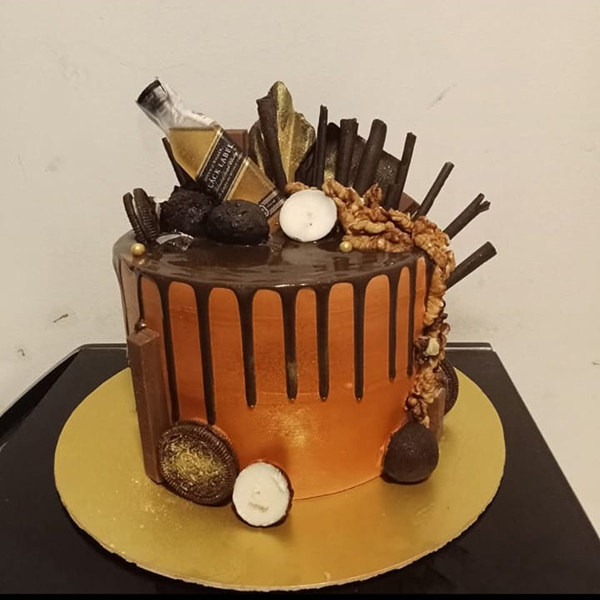 A sophisticated, tall cake with an orange-gold metallic finish and a deep chocolate ganache drip. It is decadently loaded with a miniature Johnnie Walker Black Label bottle, chocolate wafers, Oreos, and toasted walnuts.