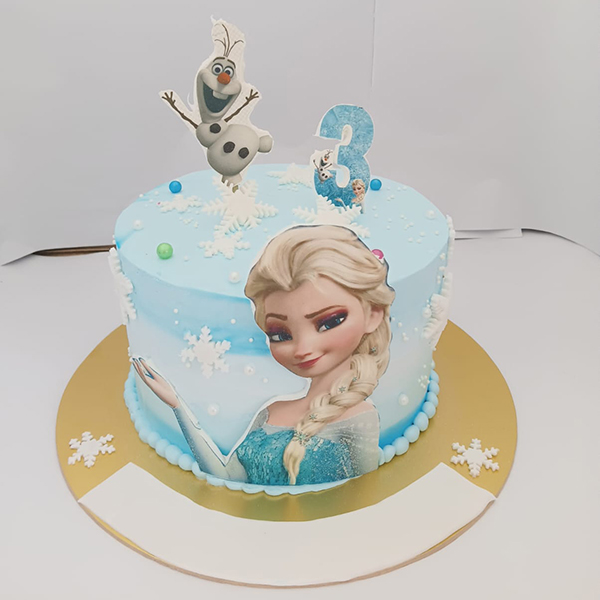 A vibrant light-blue ombre cake celebrating a 3rd birthday with iconic characters Elsa and Olaf. It features delicate snowflake accents, pearl sprinkles, and a custom number “3” topper.