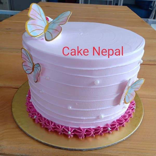 This minimalist cake features soft lavender horizontal pleats and a deep fuchsia star-tip border. It is accented with white pearls and delicate paper butterflies that appear to be landing on the cake.