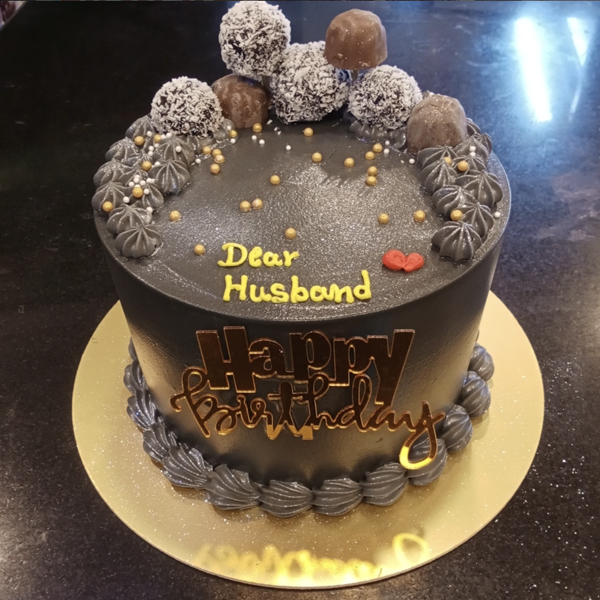This sophisticated tall single-tier cake features a smooth, matte charcoal-grey buttercream finish with a subtle shimmer. It is topped with a generous assortment of coconut-dusted truffles and smooth chocolate bonbons, accented by delicate gold sugar pearls. The design is finished with a bold “Happy Birthday” gold acrylic topper and a personalized “Dear Husband” message, creating a luxurious and masculine aesthetic.